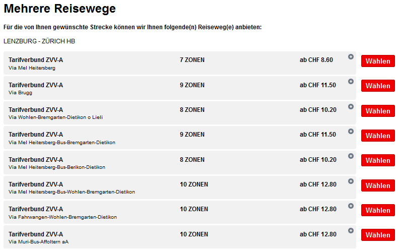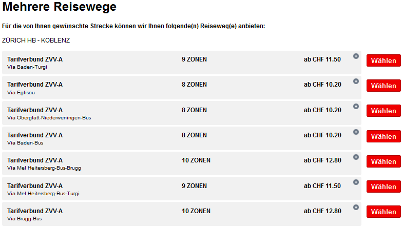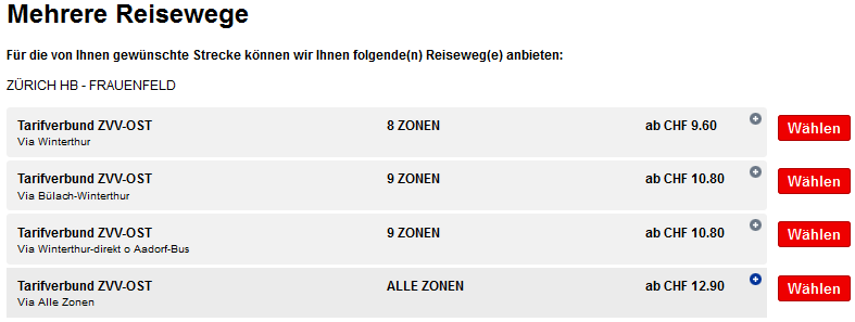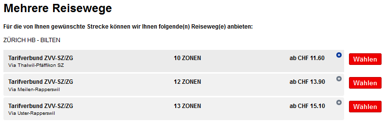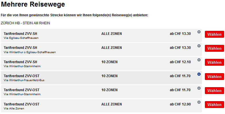 ... nach Stein am Rhein gibts dann schon 6 vorgeschlagene Wege mit vier verschiedenen Preisen...,