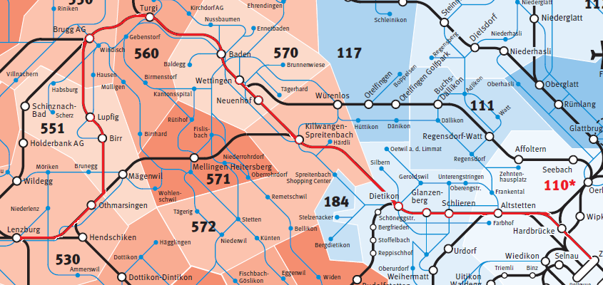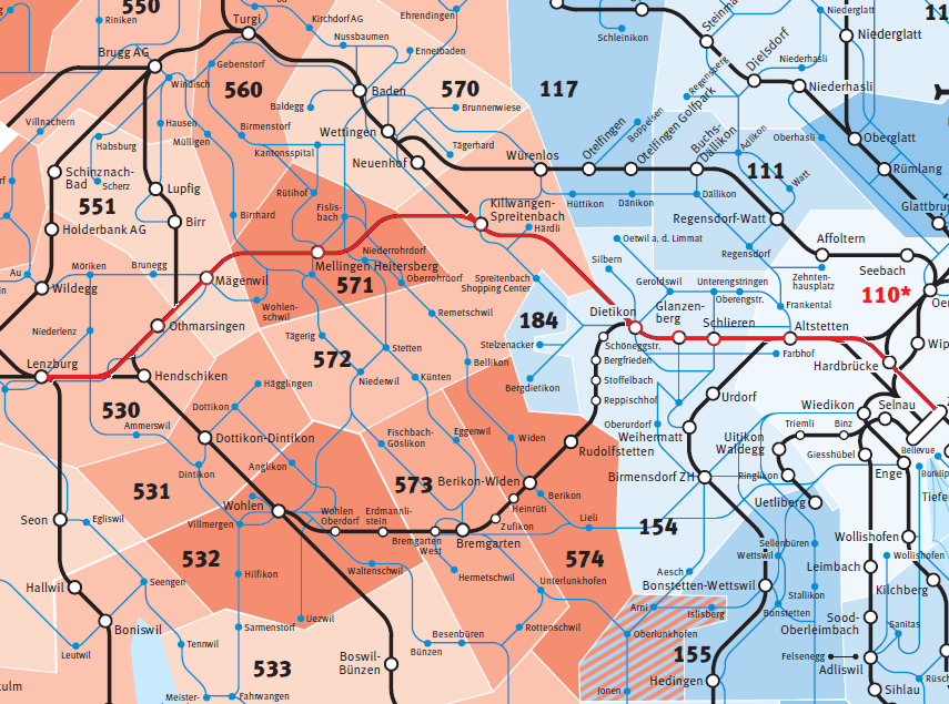 Das Dumme daran: wer den falschen Weg wählt für die beabsichtigte Fahrt, gilt in der Regel als Schwarzfahrer, und das kann selbst dann der Fall sein, wenn man sogar mehr bezahlt hat als man hätte müssen. Ob man zum Schwarzfahrer wird oder nicht, hängt davon ab, ob die zu befahrenden Tarifzonen auf dem Billett mit den Zonen des tatsächlichen Reisewegs übereinstimmen. Ich nehme dazu mal das Beispiel Lenzburg-Zürich und die dort angegebenen Daten ein wenig auseinander.
