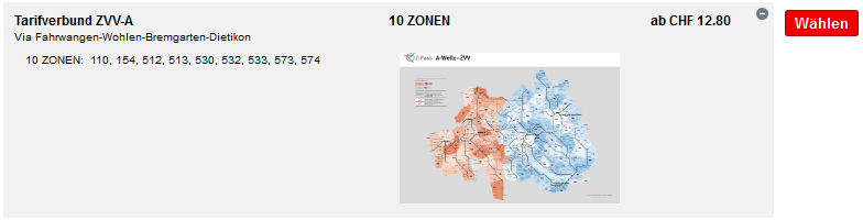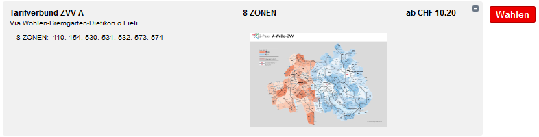 10 Zonen zum Preis von 25.60 Franken. Die berechtigten Zonen sind in diesem Falle 110, 154, 512, 513, 530, 532, 533, 573 und 574. Um diesen Fahrweg auszuführen, müsste man per Bus von Lenzburg nach Fahrwangen, dort umsteigen auf einen Bus nach Wohlen und ab dort dann mit einer S-Bahn bis Dietikon und von dort mit einer weiteren S-Bahn dann bis ans Ziel. Über zwei Stunden ist man so unterwegs. Welchen Sinn diese Verbindung haben soll, wüsste ich auch gern.