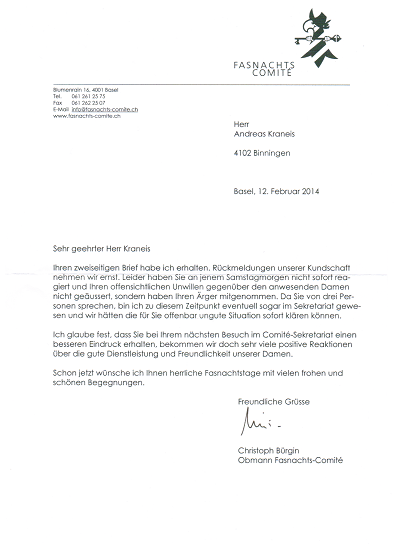 vom Fasnachts-Comité in Basel Auf meinen Brief anfs Fasnachts-Comité Basel gabs eine schriftliche Antwort innerhalb von drei Tagen. Diese Antwort will ich hier nicht vorenthalten. Ob man damit zufrieden sein kann, sei mal dahingestellt. (12.Februar 2014)