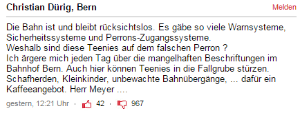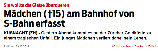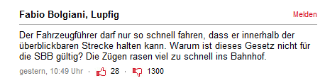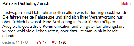 Aber es lässt sich eben nicht immer alles verdecken. So schaffte es der Unfall von Küsnacht Goldach in die Schlagzeilen von Blick Online. Der Grund liegt wohl daran, dass man die Story als abschreckendes Beispiel allen anderen vor die Nase halten kann. Seht her: so schnell kann es passieren und vorbei sein, wenn man Verbote missachtet! Interessanter als die Berichte selber sind oftmals die Kommentare dazu. Der Tenor war in diesem Falle klar: Mitleid hatte man mit den Angehörigen, dem Lokführer aber nicht mit der getöteten jungen Frau. Sie war alt genug zu wissen, dass man Bahngleise nicht überschreitet, also selber schuld. Es stachen allerdings drei Beiträge heraus, die gegen den allgemeinen Tenor die Schuld bei der Bahn suchen. Ob der Argumentation allerdings muss man sich schon fragen, ob diese Meinungen wirklich ernster Natur waren oder als reine Provokationen eingestreut wurden. Denn sie lassen ein wenig an dem zweifeln, was man gesunden Menschenverstand nennt.